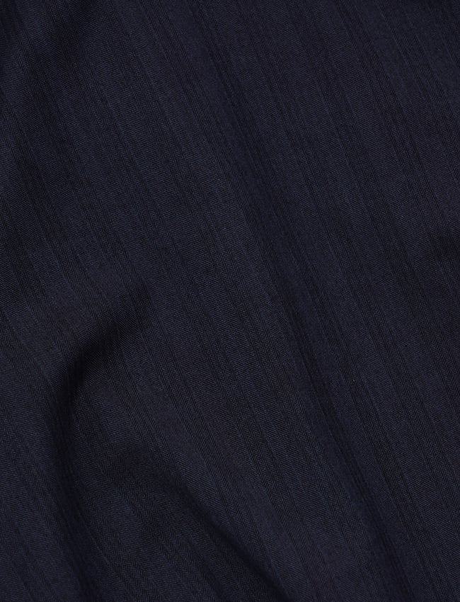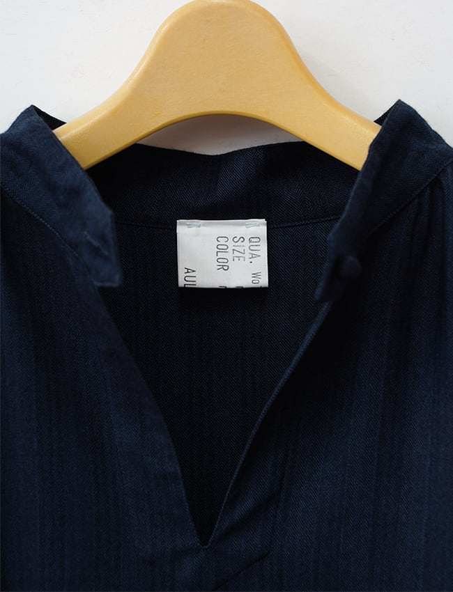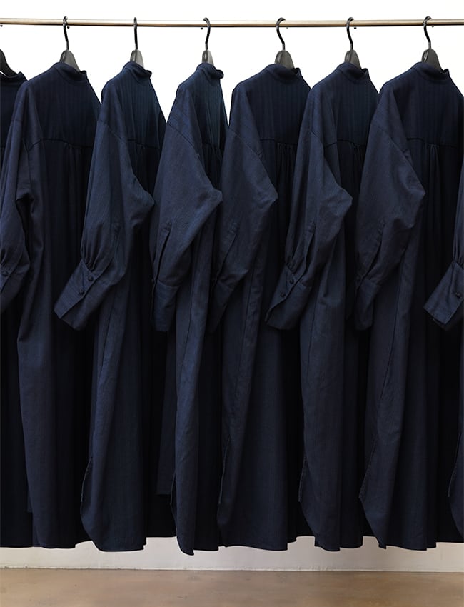 穏やかで鈍いネイビーブルーは、製品染めによるもので、パーツの切り替えが静かに繋がる印象を与えます。