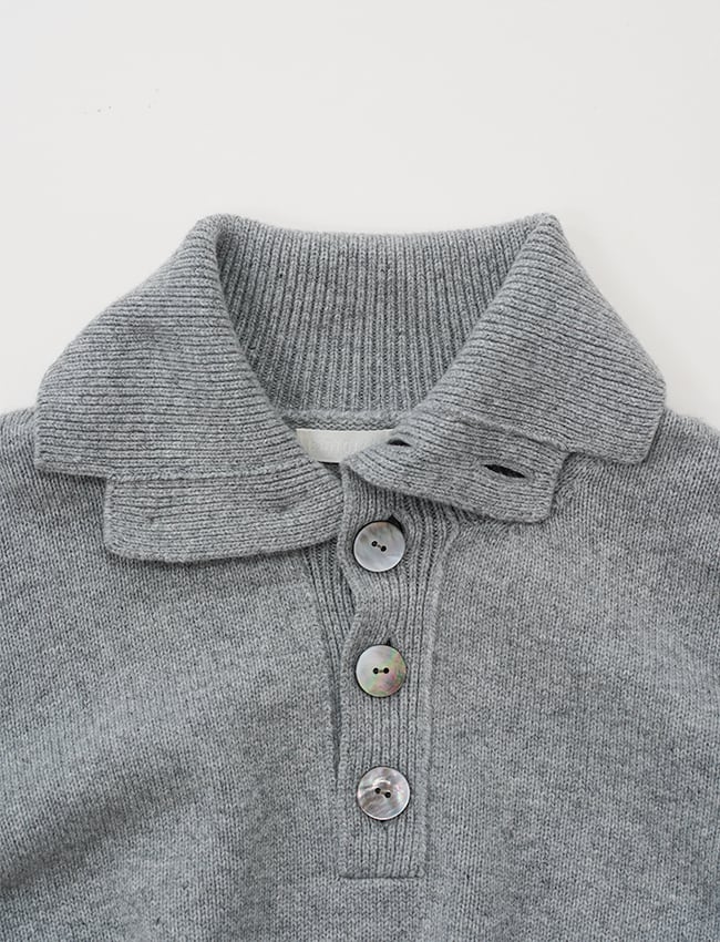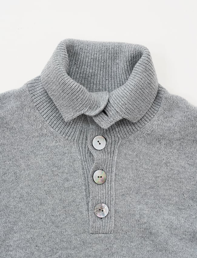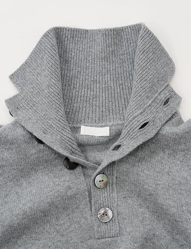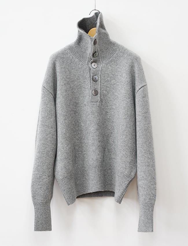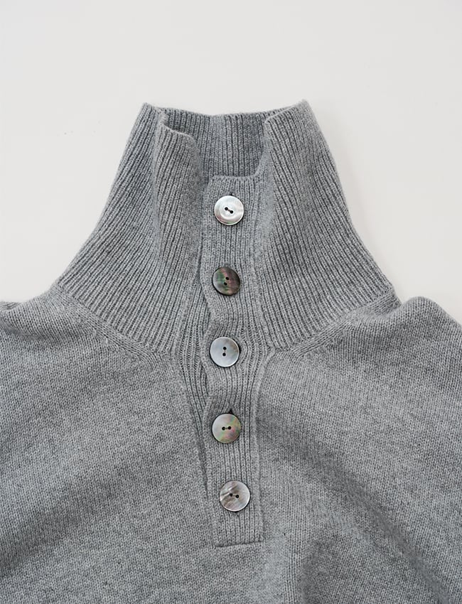 ウール・カシミア素材のハイネックニット。十分な肉厚を保持しながらも、ソフトな質感。25ミリのシェルボタンと開閉によってネックラインの印象が大きく変わる仕様。着丈はやや短めですっきりとした印象。毛羽を抑えた仕上げは、滑らかな肌触りと相まって、見た目よりも軽い着心地。