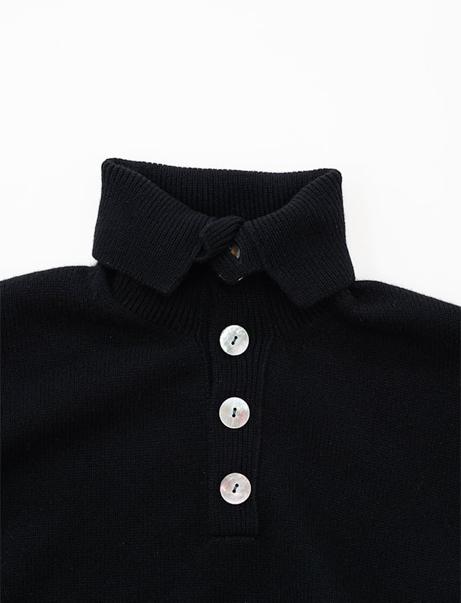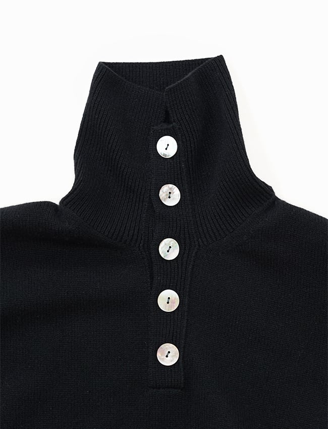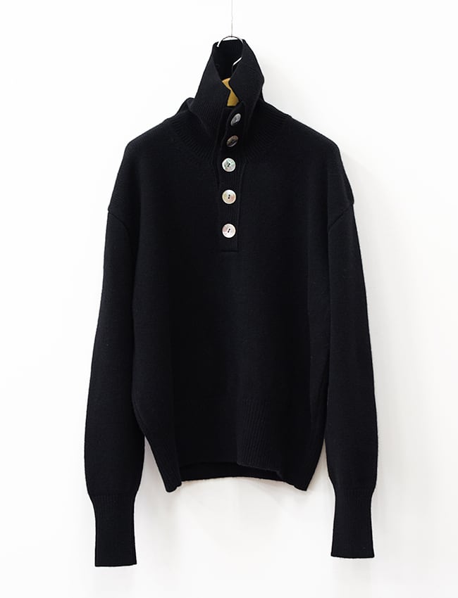 ウール・カシミア素材のハイネックニット。十分な肉厚を保持しながらも、ソフトな質感。25ミリのシェルボタンと開閉によってネックラインの印象が大きく変わる仕様。着丈はやや短めですっきりとした印象。毛羽を抑えた仕上げは、滑らかな肌触りと相まって、見た目よりも軽い着心地。