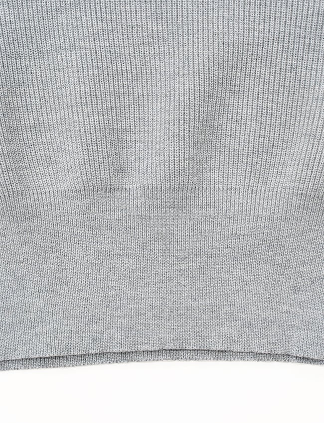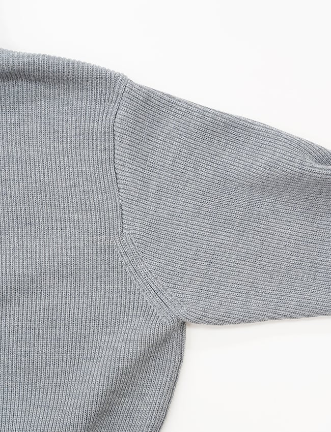 密度があるのに跳ね返すような力強い質感が特徴。織物用の強靭な糸を採用することで、アウターのような耐久性。表目と裏目が緻密に並び、彫刻のような筋が浮き立つ。肉厚で筋肉質な手触りながら、袖を通せば、しなやかな伸縮性に包まれる着心地。