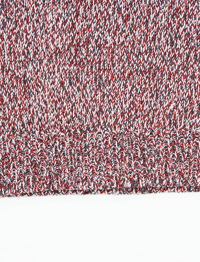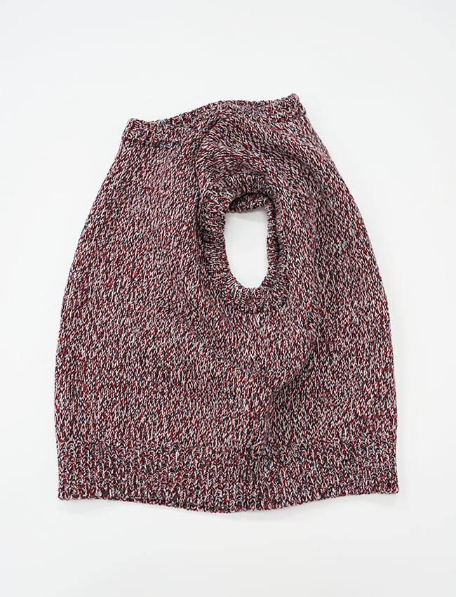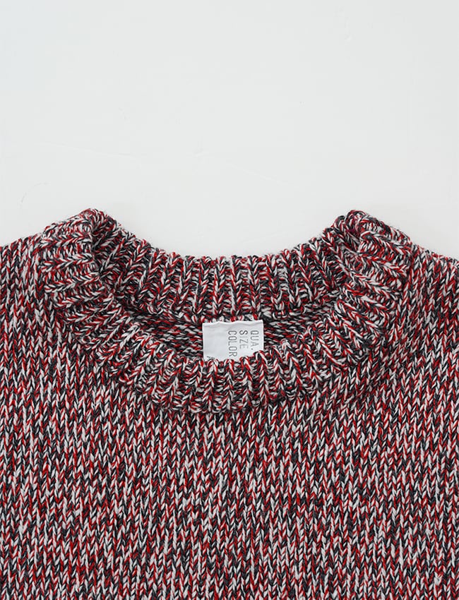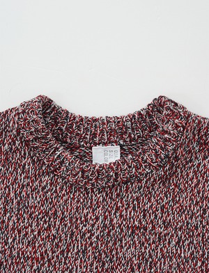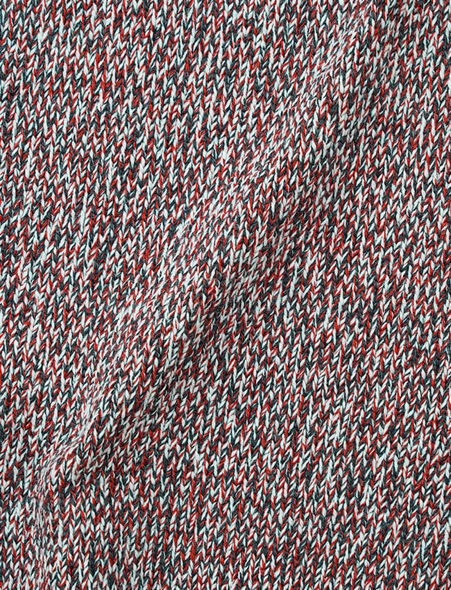 繊細な光沢のコットンのコーマ糸1色に対し、バルキー性の高い南仏産メリノウール2色を混用することで、肉厚かつしなやかな質感とコットンの微細な光沢は、フレンチメリノの素朴な風合いに滑らかな上質感を与えた。身幅は、着用時に下方向へと落ちることで視覚的にコンパクトなシルエットへと収束する設計。仕上げの工程では、通常よりも長時間の洗い仕上げを施し、輪郭の明瞭なメランジ感と、特有のモチモチとした風合い。
