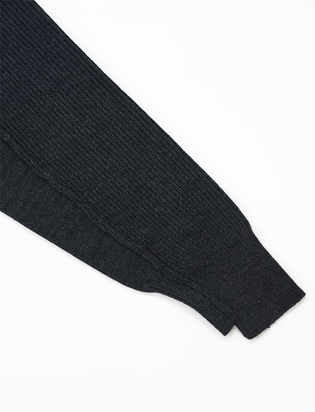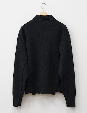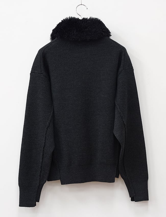 寒暖差の激しいブルガリア地方の山岳地帯で育まれた羊の毛は、クリンプ性が強く、凝縮感のある質感が特徴。通常は、やわらかい「ニット用の糸」を採用してつくられているが、密度と強い輪郭を具現化するため、織物用の強靭な糸を採用した。華美を排した自然な印象は、デニムのボアカラー・ジャケットを下敷きにしたことによるもの。