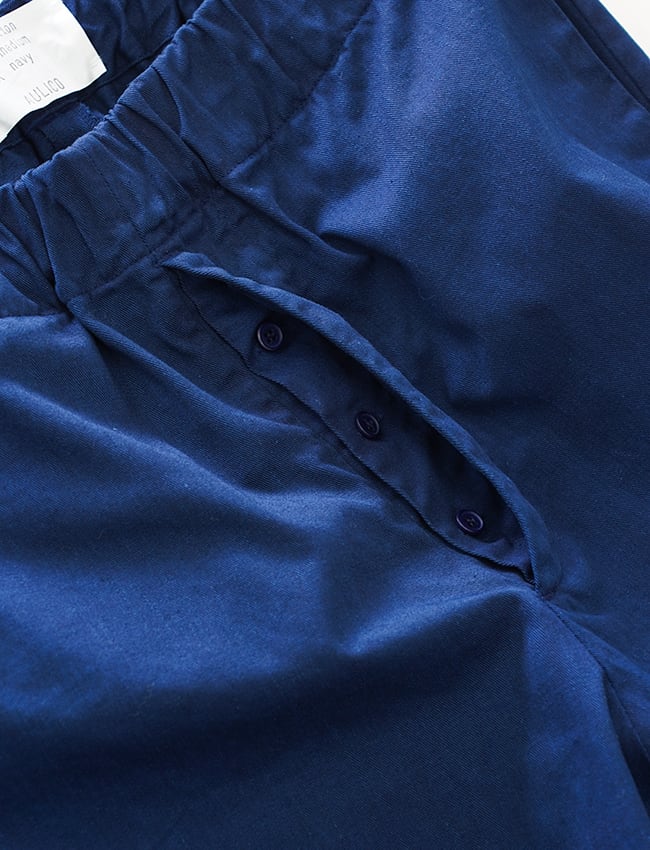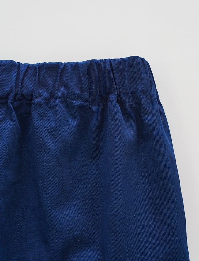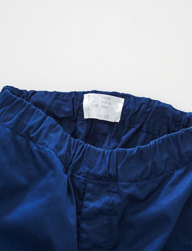ウエストは軽めのゴムと共生地のヒモ仕様。ギュッと締めても、リラックスした状態で穿いたときにもきれいです。2サイズ展開ですが、フリーサイズのような感覚でお選びください。硬めの素材感とマットな光沢が、きちんとした印象を与えつつ、どこか上品なラフさを忍ばせます。