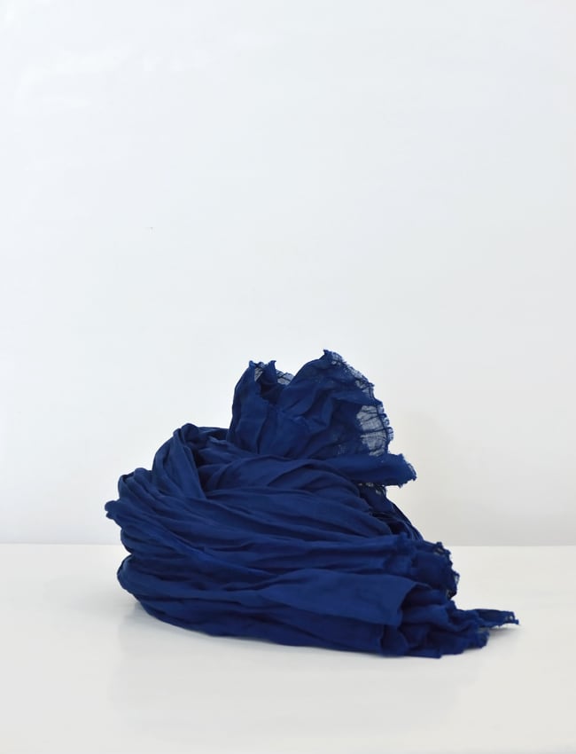 製品段階での染色によって、透明感のあるブルーとしなやかな質感を残すように仕上げています。