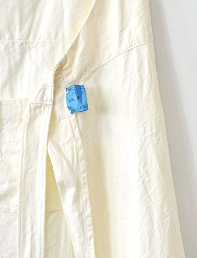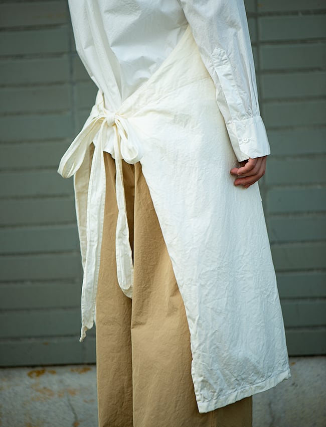 コットンの縦糸に繊維が中空の構造を持つカポックを緯糸に用いた素材のエプロン。