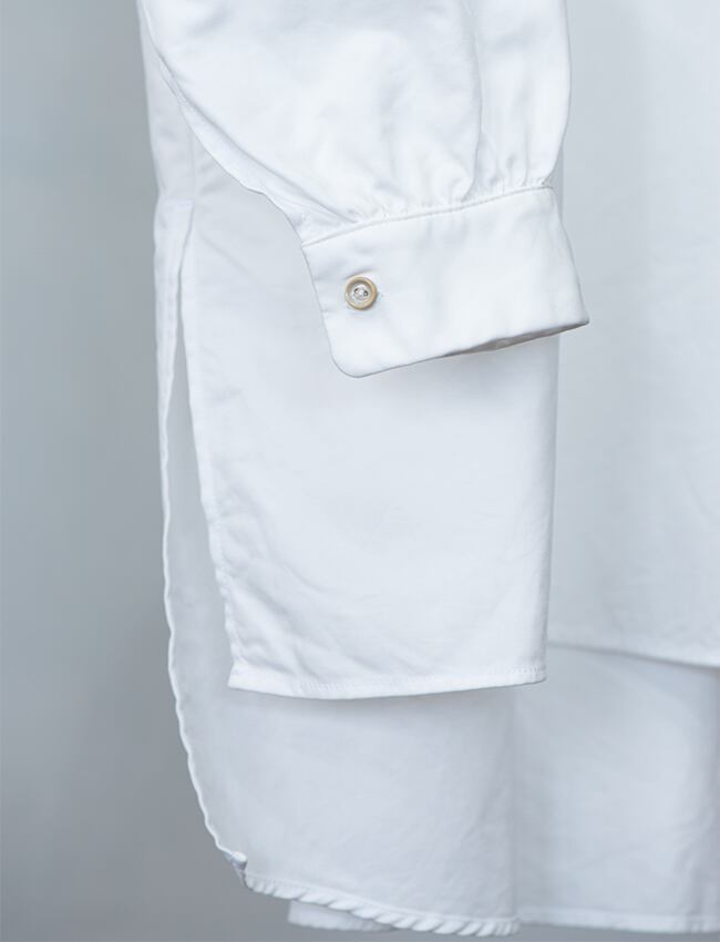 ベージュ色の半陶器ボタンを用いたシャツ。