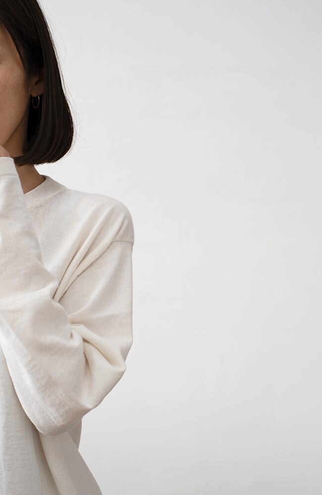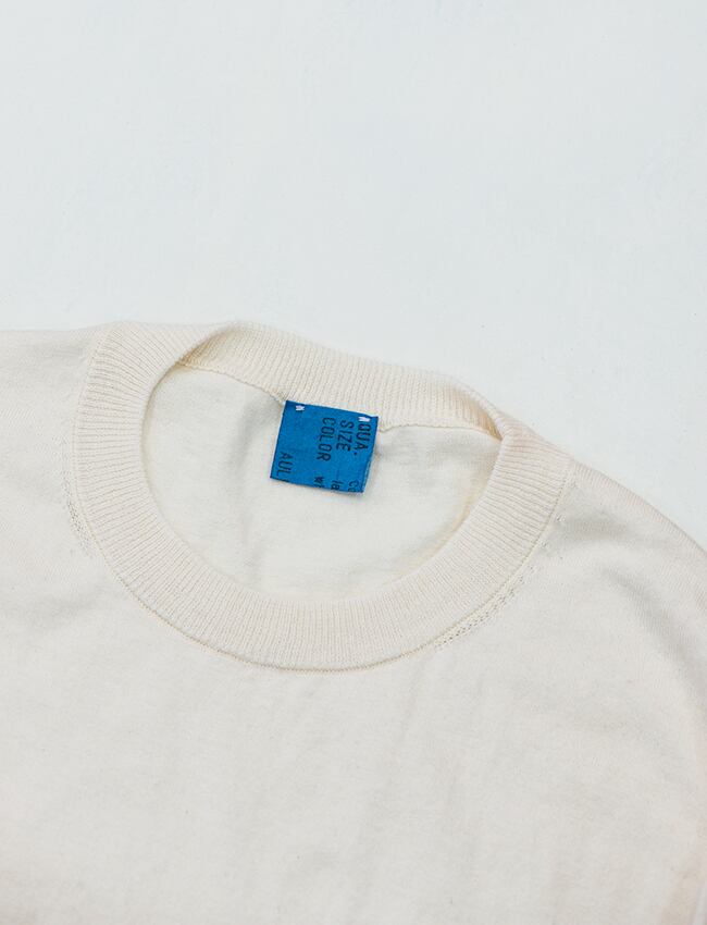 通常のTシャツであれば、折って縫う始末をする裾と袖の部分も袋状の編み地の仕立て。