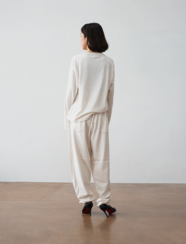 製品段階での水洗いによって、より膨らみのあるやわらかな質感としっとりした手触りに仕上げています。同素材のパンツがございます。