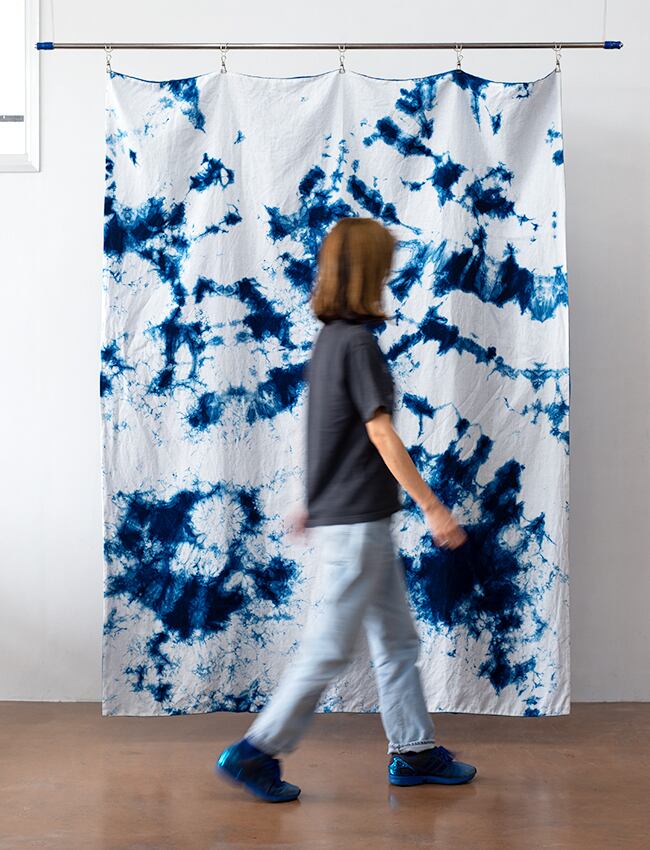 染色と洗いをそれぞれに行った異なる2枚の麻生地を組み立てることで、無機質な表情にわずかな趣きをもたせた。