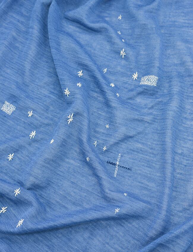 製品ごとに刺繍を行った後、水洗いをすることで湿度のある光沢としなやかな肌あたりに仕上げたストール。