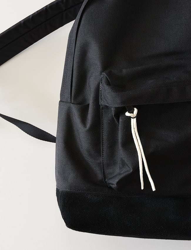 本体は滑らかなナイロン素材、底部分には同色のスウェードレザーで構成によりシックな佇まいに。