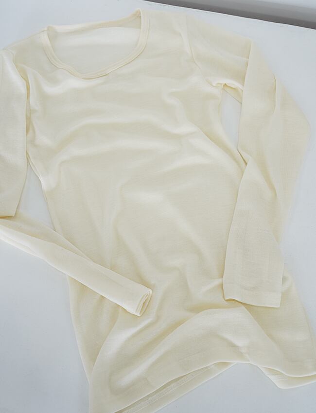 自社工場の吊り編み機でやわらかく編み上げられたウールとシルクのニット素材は、肌触りが優しく着心地が快適です。