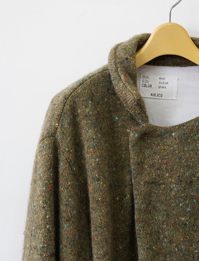 表地にウールを裏地はコットンを使った2枚仕立てによりボリューム感をつぶさない仕上がりのジャケット。マットで粗めな見た目はランダムに絡ませたいくつもの色糸によるもの。