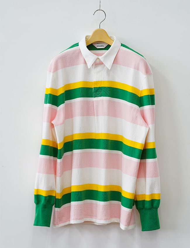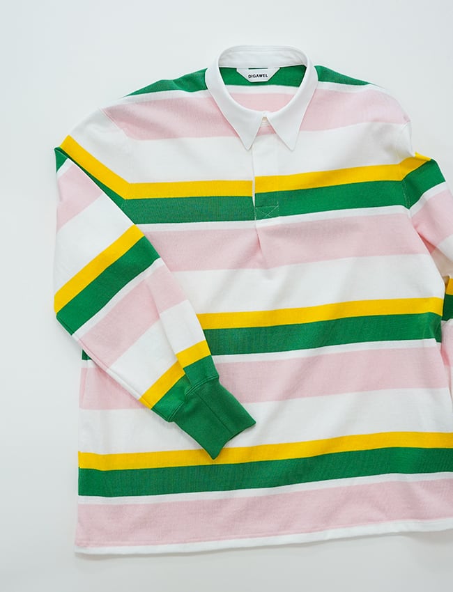 前開き留まりにタックを入れ、シルエットは大きめな設定のすっきりと整えられたラガーシャツ。