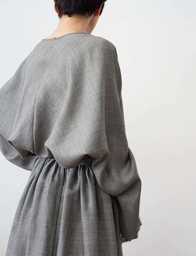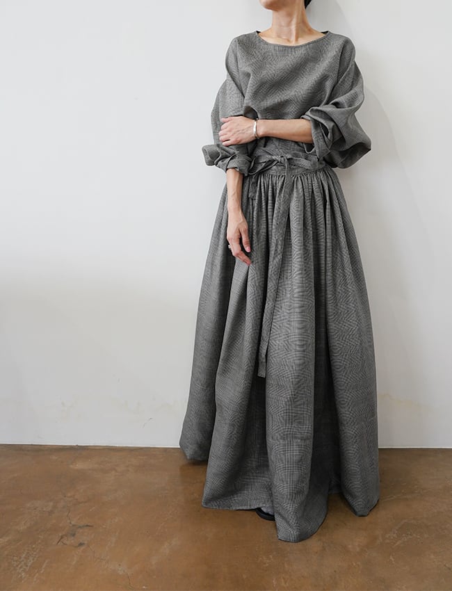 張りのある質感と、冷たい光沢のあるウール素材。上下にそれぞれ分かれたワンピースなデザイン。長袖も、スカートも、それぞれ1パーツでの構成。チェックの図柄を歪まないように組み立てたことで緊張感のある印象に。継ぎ目を最小限にしたしたことで滑らかな輪郭とボリュームのある上品でリラックスな仕上がり。巻きスカートが、ミディアム丈とロング丈の2サイズからお選び頂けます。ウエスト部分の全長も、サイズによって違えておりますがどちらも充分な長さがあります。