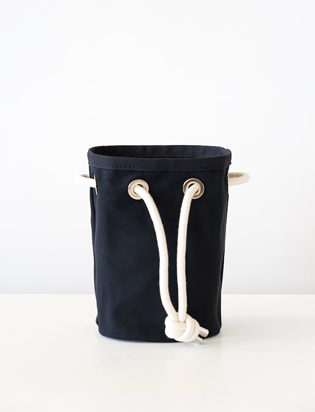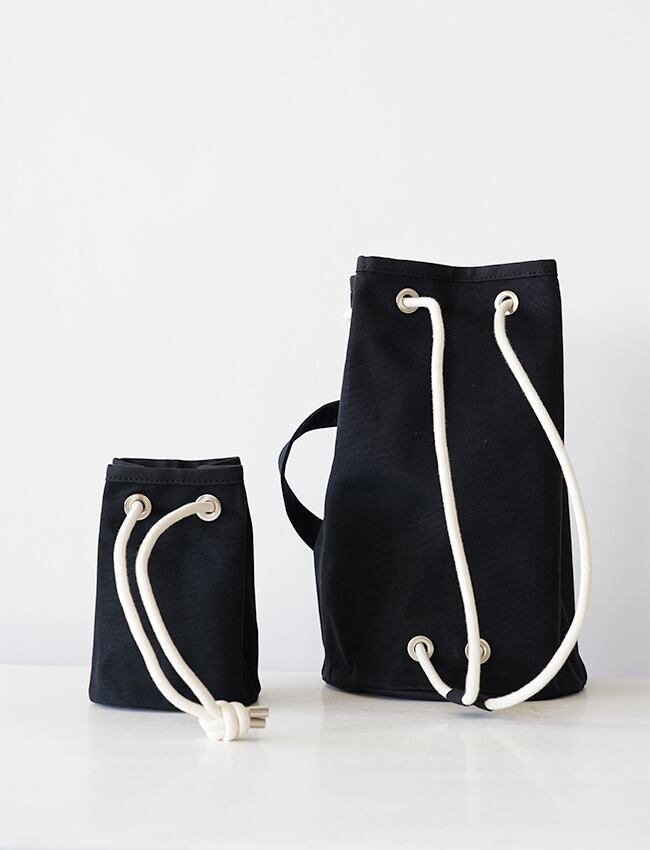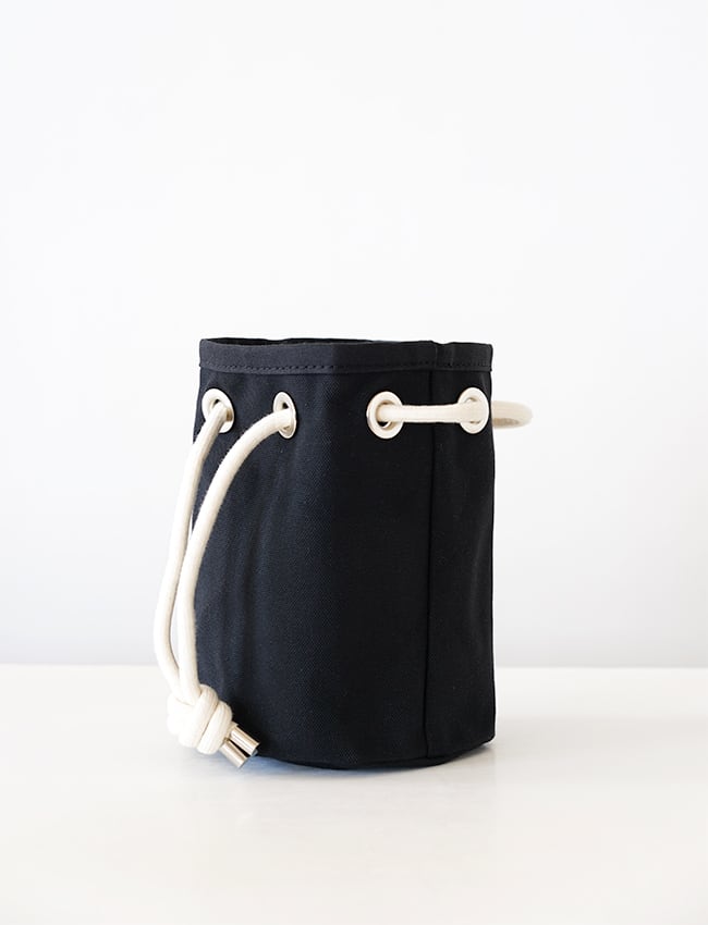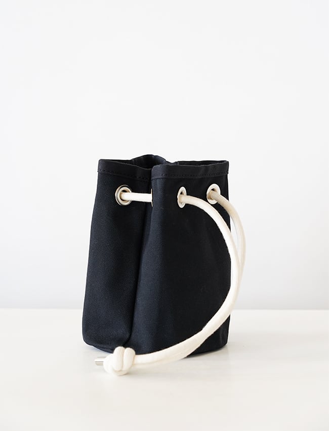 単色のコンパクトな見た目のゲームポーチ。8個のハトメ穴を通した紐は、肩掛けと、二重にしたときは手持ちでの仕様。ものを収納したときのコンパクトな輪郭は約15㎝の丸底での構成によるもの。