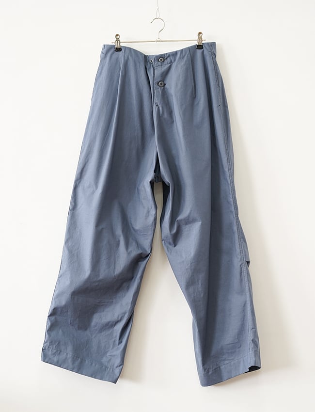 コットンの軽量な素材のパンツのため、腰に引っ掛けて穿いたときにもリラックスなパンツです。ウエスト内側には、同色ヘリンボーン地のコットンテープを使用。前中心のボタンでウエストを調整します。