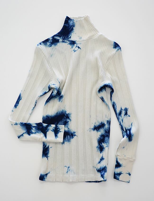 繊細な濃淡とくっきりと染め残る白は、編地を引き伸ばされた形状の製品での染色を繰り返したことによるもの。