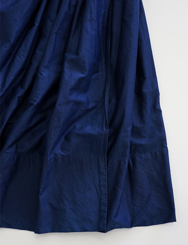 光沢あるコットン素材は、染色を繰り返したことで湿度のあるブルーと密度のある質感に。