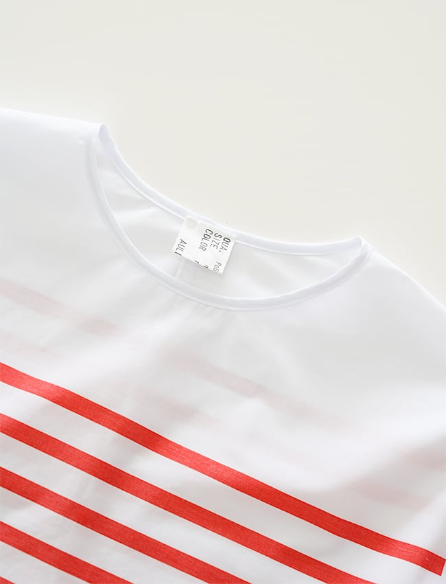 まっすぐなボーダー柄を継ぎ目のない一枚に配置しポリエステル・コットン素材の軽さに加えて、ボーダーがない部分とボーダー部分の分量も軽快なバランスに。