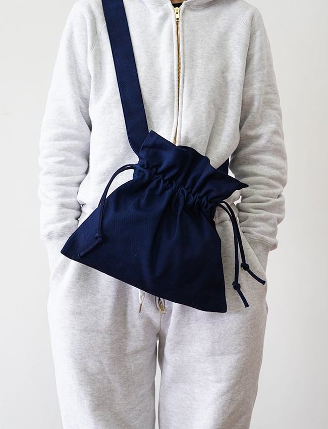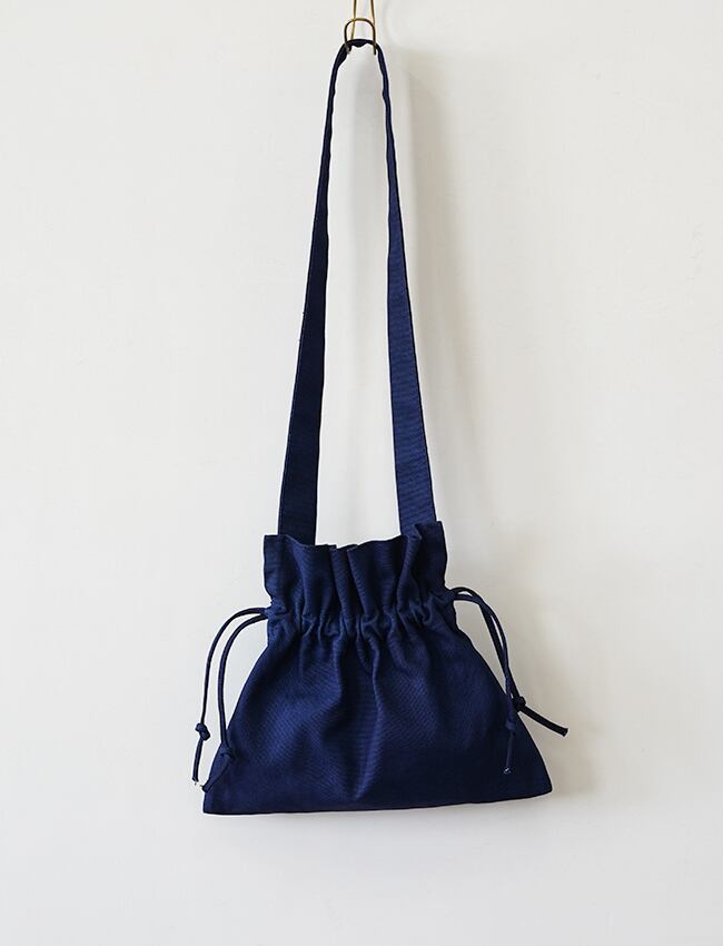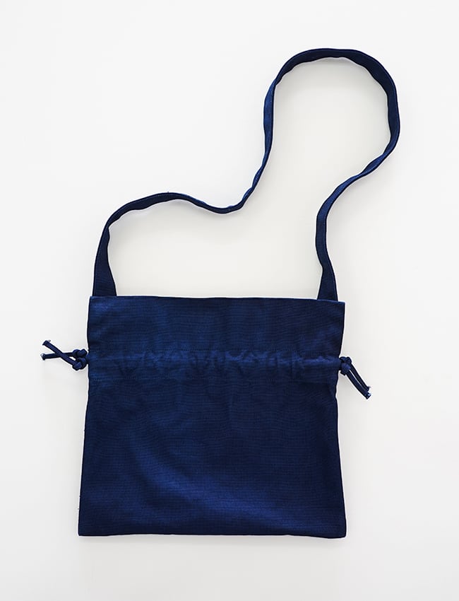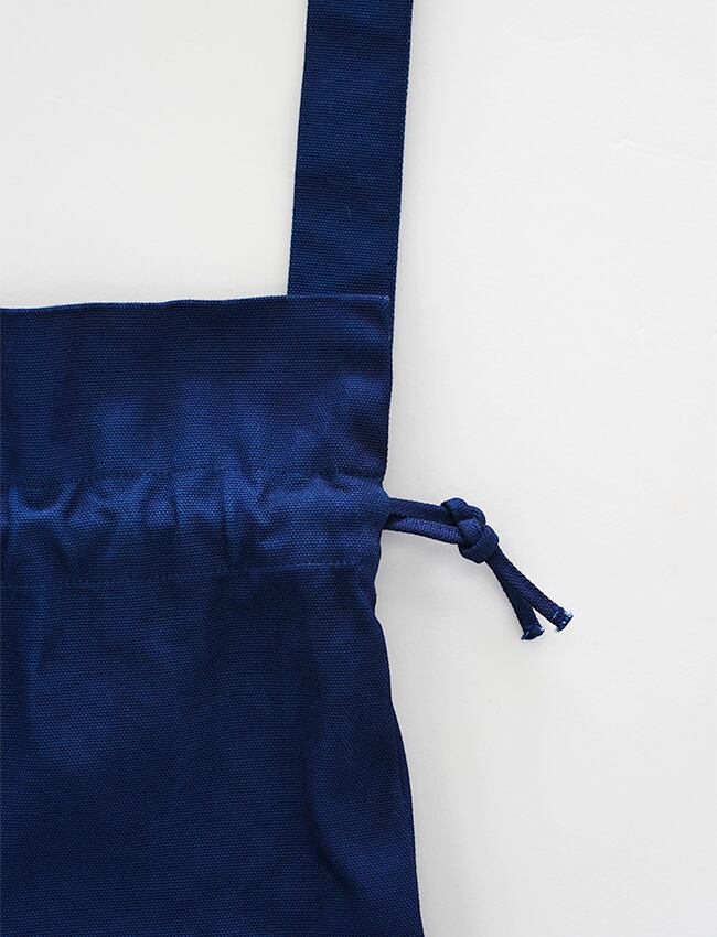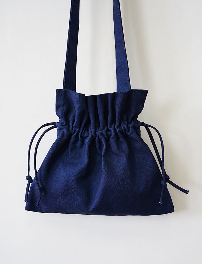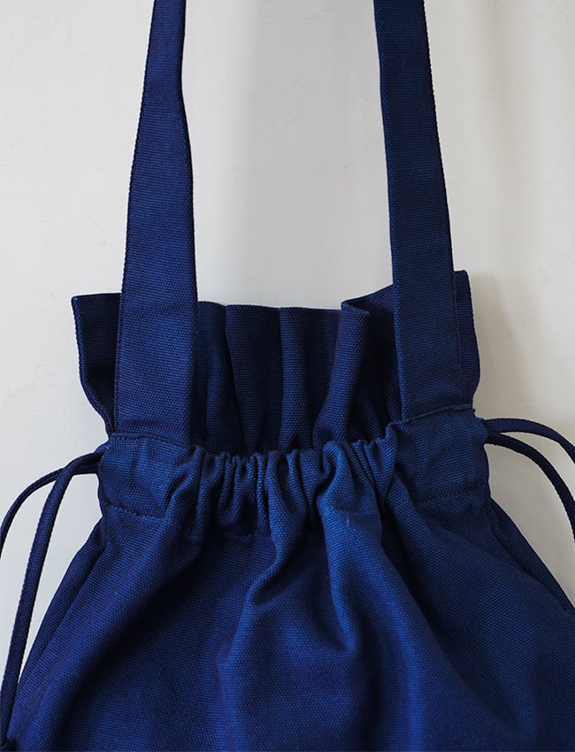 密度の高い手触りと厚みのある質感は、強度がありながら撓る滑らかさが特徴。適度に弾んだ生地と染み込んだブルーの風合いは、染色の加工により水分を充分に含んだことで織り目が過密になったこによるもの。肩掛け部分は、袋の開閉の具合で長さが調整可。