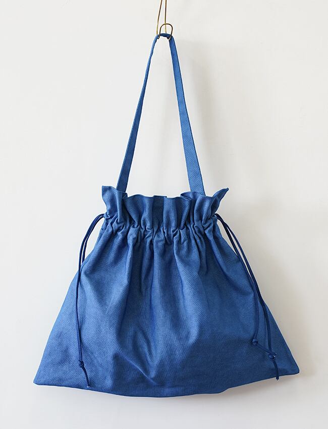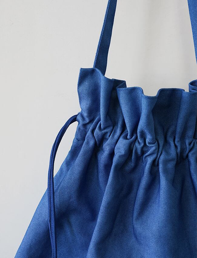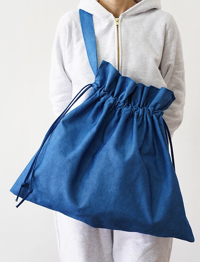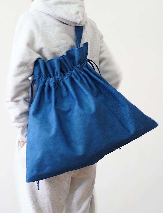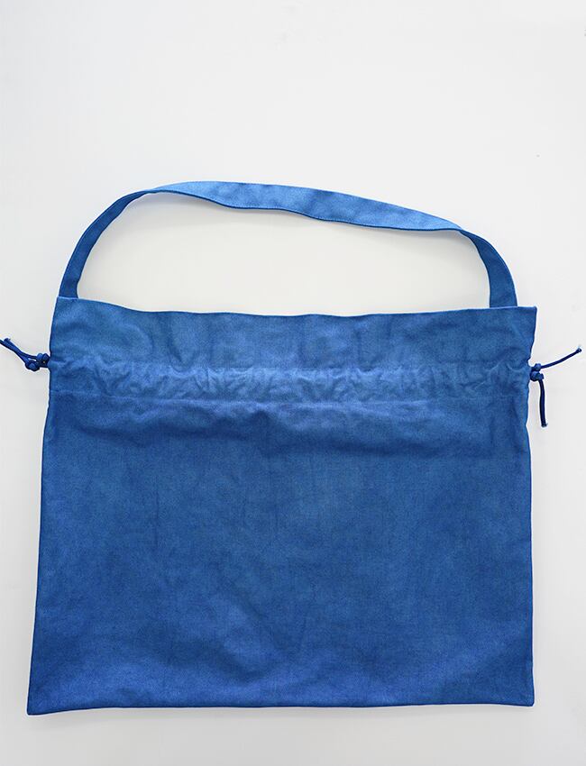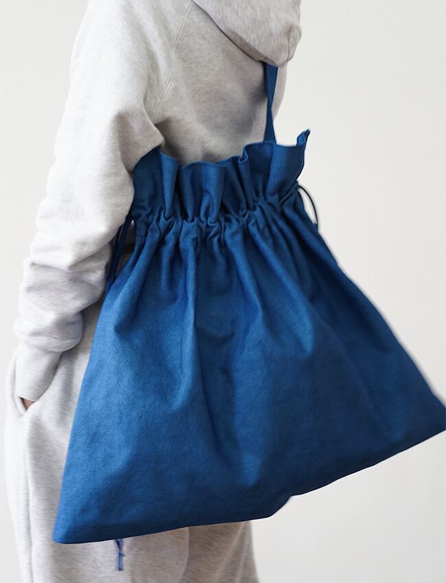 密度の高い手触りと厚みのある質感は、強度がありながら撓る滑らかさが特徴。適度に弾んだ生地と染み込んだブルーの風合いは、染色の加工により水分を充分に含んだことで織り目が過密になったこによるもの。肩掛け部分は、袋の開閉の具合で長さが調整可。