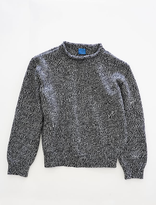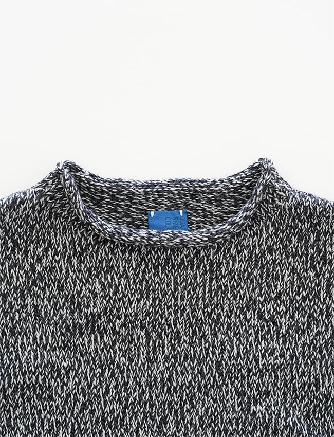 かすかにツヤのあるコットンのコーマ糸を1色と、膨らみの強い南仏羊毛のメリノ種の糸を2色で構成、もっちり感のあるしなやかさが特徴。撚りあわせた3色の糸、ブラック、チャコールグレー、オフホワイトで構成。コットンのかすかに湿度のあるツヤ、落ち着いた僅かな光沢が全体に帯びることで、フレンチメリノのソフトな印象になめらかな上質さと風合いをもつニット。